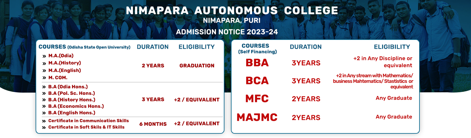 Affiliated to UTKAL UNIVERSITY, ODISHA. Nimapara Autonomous College is now a full-fledged NAAC accredited autonomous, Non-Govt. Degree College, the first of its kind in Puri district. Established in 1963, Nimapara Autonomous College has already covered 54 glorious years, moulding the minds of students from Konark in the East to Pipili in the west from Astarang in the North to Puri in the South. Accredited B+ by NAAC in 2005 and conferred with Autonomous status in 2011, Nimapara College is now a full-fledged NAAC accredited autonomous, Non-Govt.Degree College, the first of its kind in Puri district. It has 15 departments with Hons. Teaching facilities for more than 3500 students.